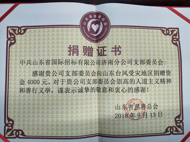 2018年9月13日下午,社區(qū)黨委書(shū)記許蕊同志等一行人來(lái)到山東省國(guó)際招標(biāo)有限公司為中共山東省國(guó)際招標(biāo)有限公司濟(jì)南分公司支部委員會(huì)送來(lái)了山東省慈善總會(huì)頒發(fā)的捐贈(zèng)證書(shū)。