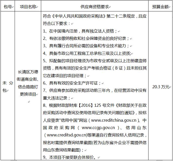 二、采購(gòu)項(xiàng)目名稱(chēng):長(zhǎng)清區(qū)萬(wàn)德街道商業(yè)街、信合路路燈更換項(xiàng)目