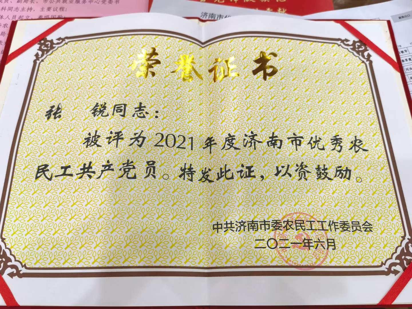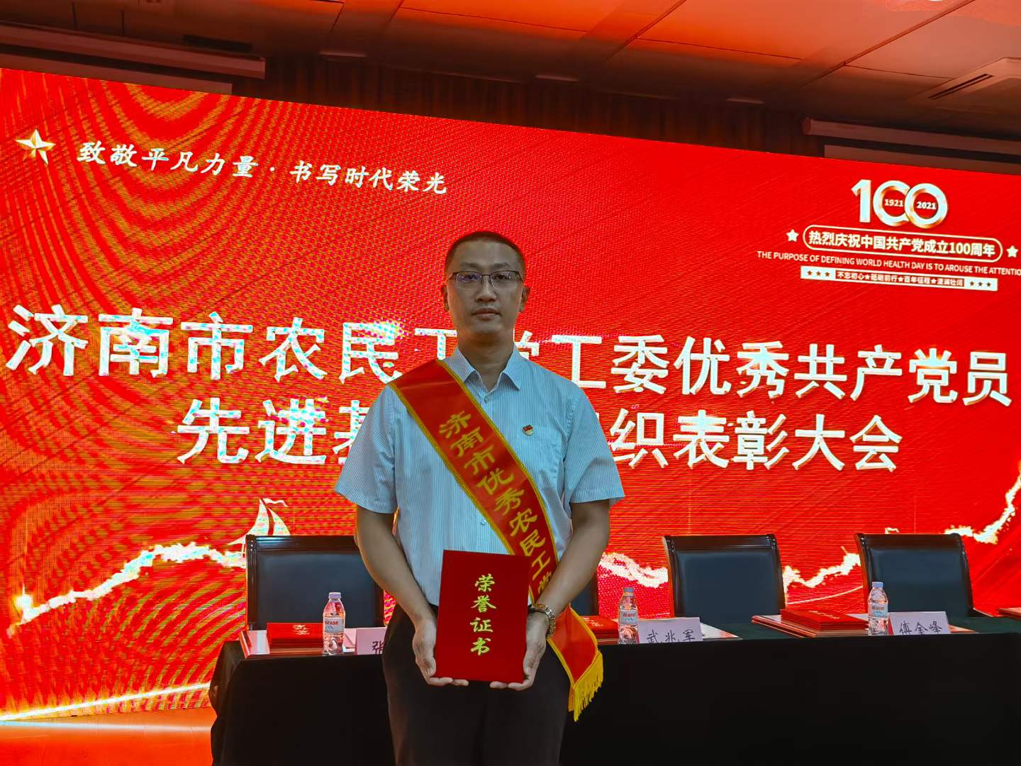6月28日召開了濟(jì)南市農(nóng)民工黨工委優(yōu)秀共產(chǎn)黨員、先進(jìn)基層黨組織表彰大會,會上我公司黨支部書記張銳同志被評為2021年度濟(jì)南市優(yōu)秀農(nóng)民工共產(chǎn)黨員。